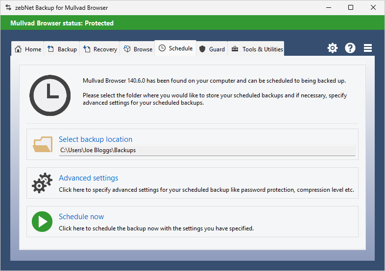 Have a look at the screenshots to get a first impression of what working with zebNet Backup for Mullvad Browser looks like. Each image is only a thumbnail and you can click on an image to enlarge it.