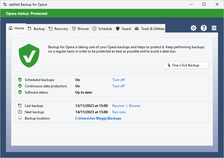 Have a look at the screenshots to get a first impression of what working with zebNet Backup for Opera Browser looks like. Each image is only a thumbnail and you can click on an image to enlarge it.