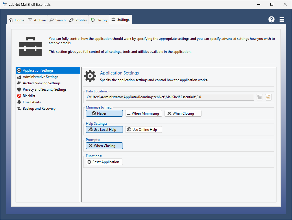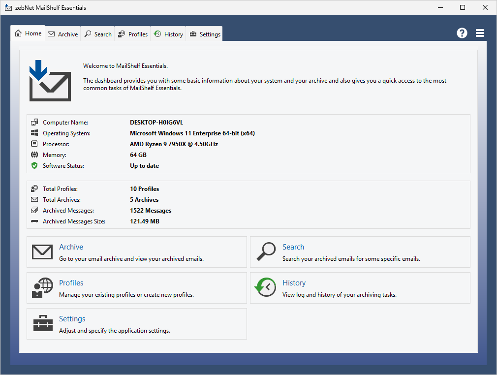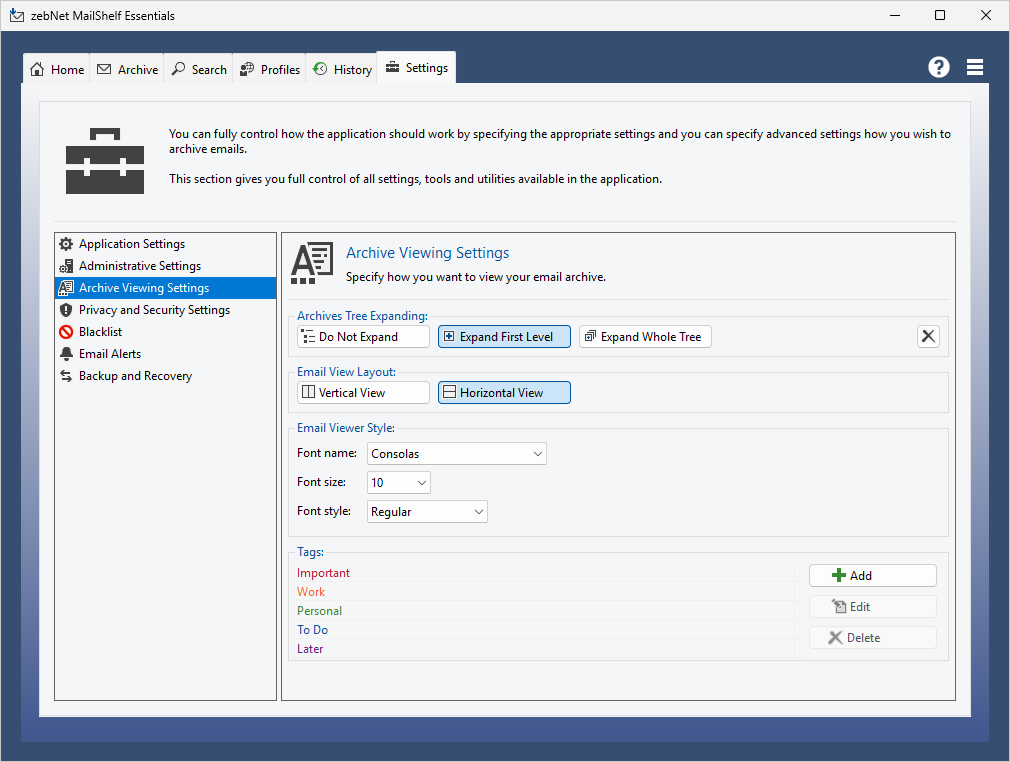 Have a look at the screenshots to get a first impression of what working with zebNet MailShelf Essentials looks like. Each image is only a thumbnail and you can click on an image to enlarge it.